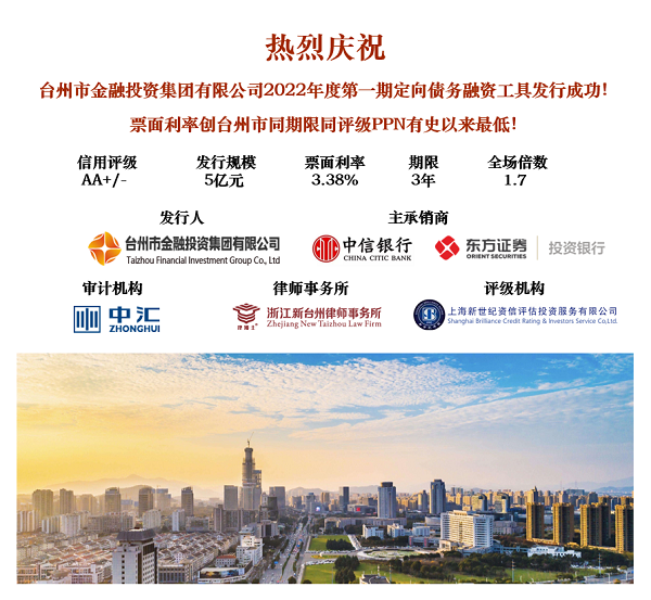 5月30日,臺州市金融投資集團有限公司(以下簡稱市金投集團)首單非公開定向債務融資工具(PPN)成功發(fā)行。發(fā)行金額5億元,期限3年,票面利率3.38%,由中信銀行與東方證券聯(lián)合承銷,全場認購倍數(shù)1.7倍。市金投集團持續(xù)關(guān)注市場動態(tài),緊抓央行降準和貸幣政策寬松窗口,在各中介機構(gòu)的支持和市場投資者的高度認可下,本次PPN票面利率創(chuàng)臺州市同期限同評級PPN有史以來最低。