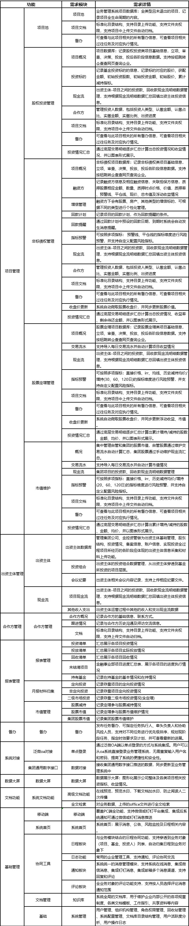 1.應(yīng)答方需根據(jù)我司現(xiàn)有的業(yè)務(wù)類型和管理模式等要求,開(kāi)發(fā)一款適合我司的資管業(yè)務(wù)管理系統(tǒng)。系統(tǒng)具體需要實(shí)現(xiàn)的功能詳見(jiàn)下表: