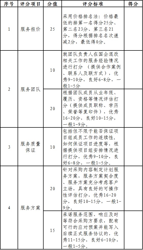 信息發(fā)布后由集團確定評審小組,組織采購評審,確定成交供應商。擬采用詢比采購方式進行評審,具體見下列評分表,根據(jù)評審結果,擇優(yōu)選擇專業(yè)中介機構。
